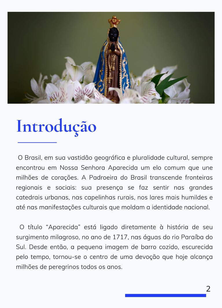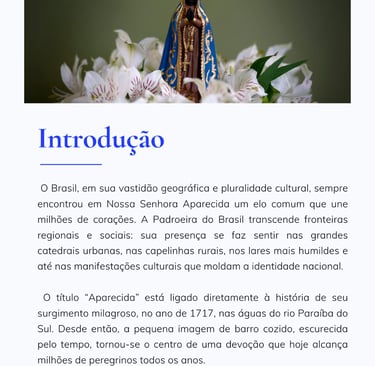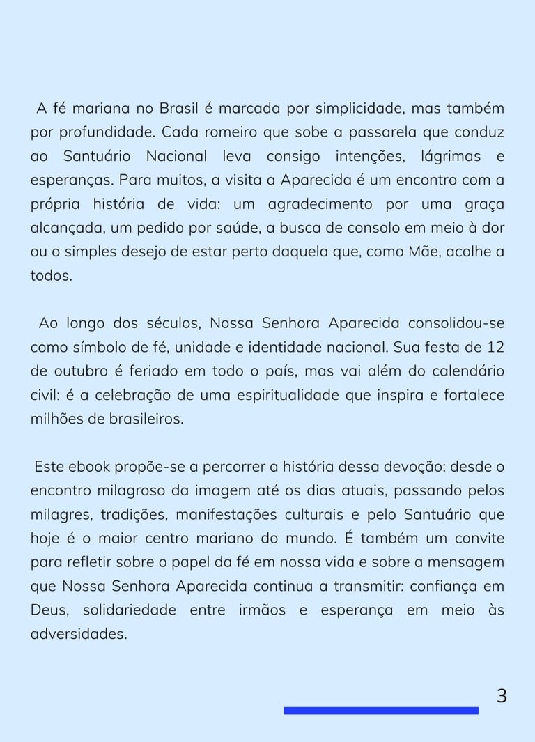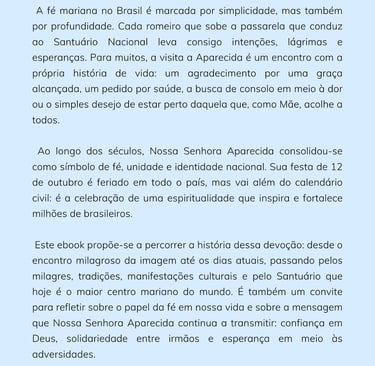 Descubra a história, fé e milagres da padroeira do Brasil com nosso e-book exclusivo. Uma leitura inspiradora que conecta você à rica tradição e devoção a Nossa Senhora Aparecida. Ideal para quem busca aprofundar sua fé e conhecimento.